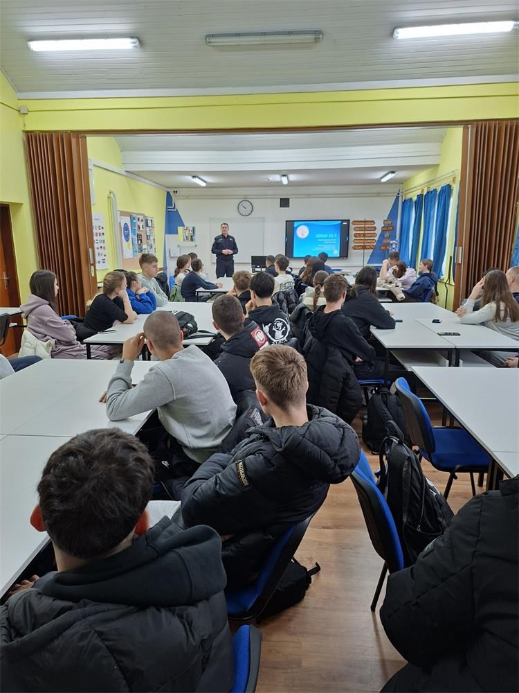 FOTO: PU osječko-baranjskaUčenici Srednje škole Valpovo imali su priliku poslušati predavanje na temu preventivnog projekta „Zdrav za 5-prevencija zlouporabe droga“, kao jedne od brojnih aktivnosti koje policijski službenici za prevenciju Policijske uprave osječko-baranjske provode tijekom trajanja „Mjeseca borbe protiv ovisnosti'' od 15. studenog do 15. prosinca.